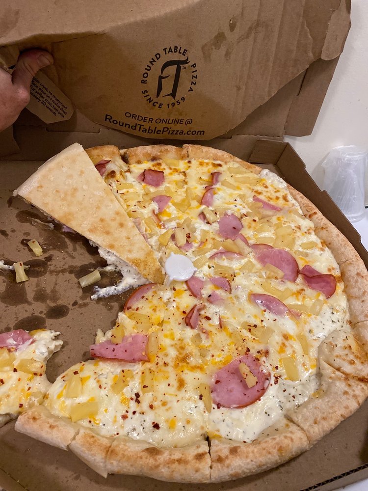 Island Style Pizza. Tender ham & juicy pineapple on zesty red sauce. 290 cal/slice.